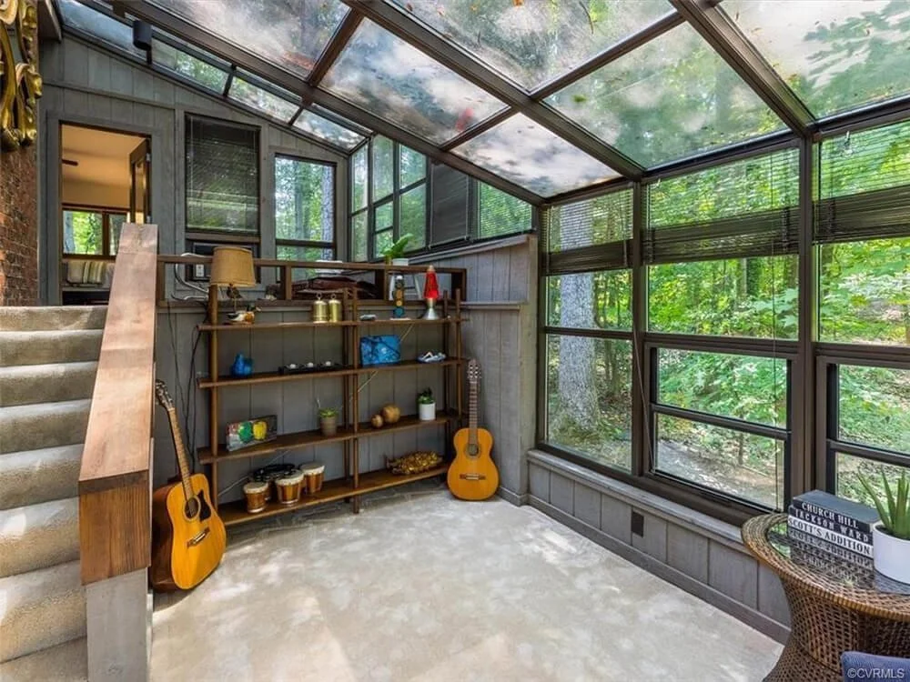 The original owners added this solarium at some point over the past 46 years, presumably because they wanted the luxury of a hot tub outside their master suite. So you’ll see that the space was designed as a two level space with the drop-in hot tub at the top level with a door into the master bedroom. My Netflix brain just imagines all of the swinging hot tub parties that happened in that space over the years. The lower level served as a den space or music room judging from the guitars.