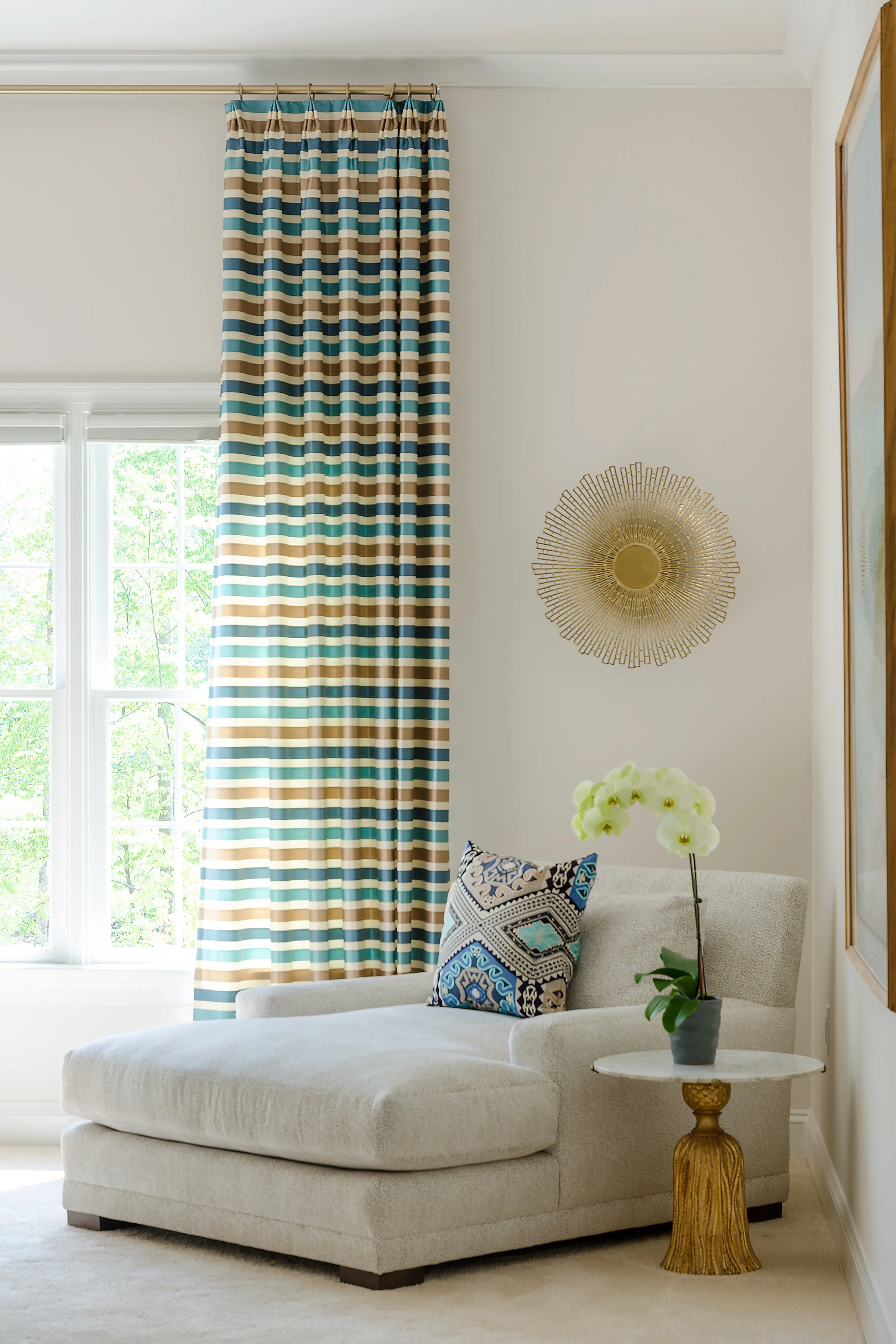 With daylight savings causing longer nights, we want to take full advantage of any sunlight we can get! I frequently encounter clients who are worried that window treatments will take away the light from their windows. However, if planned correctly, simple long panels on the sides of a window can beautifully frame that view without hindering any light. If your home is older and has some drafty windows, long drapery with heavier lining can go a long way to insulate a room and keep you warmer and cozier during these cold winter months. If you don’t want to spend the money on full width drapery panels to cover your windows, you can add shades for light control, privacy and insulation. There are some terrific shade options that incorporate materials and technology to help cut down on light and drafts. And while fabrics and shades are subject to some of these supply chain delays, they seem to be weathering this storm with a bit more ease. With the increase in demand in the interiors space, our workrooms are busier than ever, but with careful selections and planning, you can have new beautiful window treatments in as early as 6 weeks.