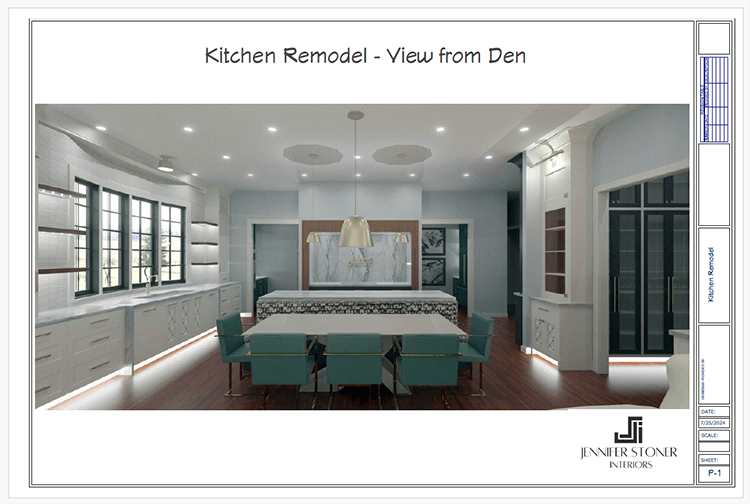 Click on the image below to see an example of one of our kitchen design projects and the layout that we presented to our client during the Specifications Phase. This type of presentation helps our clients evaluate the various options they can select that they may not have even considered.